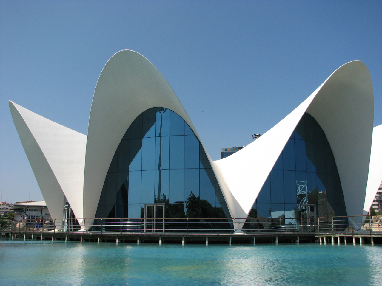 La cité articule ces différents éléments par des bassins d’eau et des jardins (on vous conseille d’y venir le soir pour pouvoir vous promener dans les jardins éclairés). L’architecture est ultra-moderne tout en faisant référence à des éléments naturels (certains éléments ont la forme d’ossements d’animaux) et utilisant des éléments locaux, comme la céramique dont la région de Valence est une grande productrice.