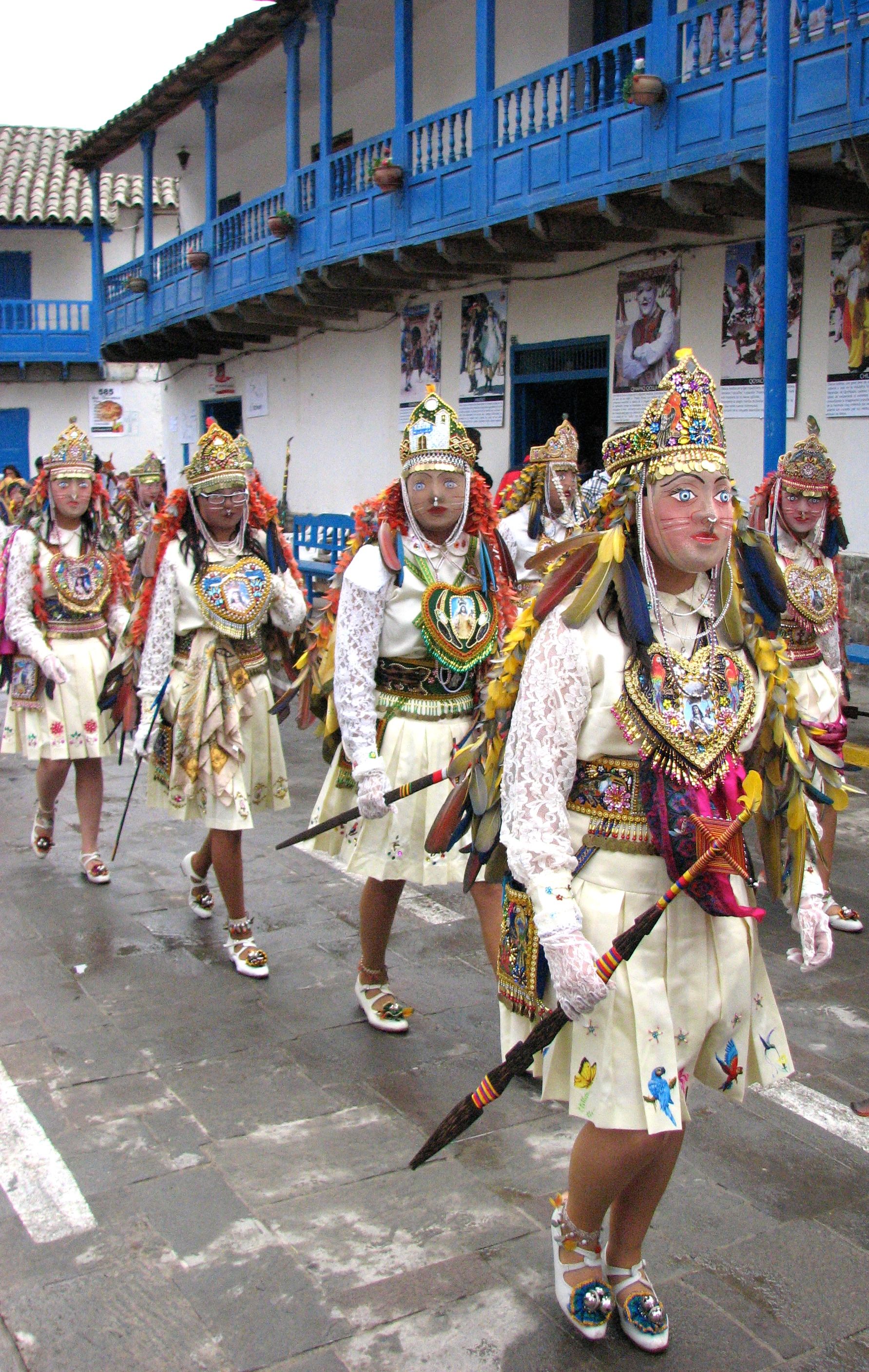 Les participants sont divisés en plusieurs groupes, qui tous ont leur cargo (=fanfare). Ils ont chacun leur danse et chantent en quechua. Les costumes des groupes sont très aboutis : très colorés, comportant de nombreux motifs et accessoires. Les participants sont déguisés en démons qui seront défaits par la Vierge ou encore en groupes symboliques de l’histoire du Pérou. On retrouve les Indiens d’Amazonie (reconnaissables par leurs plumes de perroquets) ou encore les Qhapak Negro, groupe d’esclaves noirs destinés aux mines d’argent de Potosi et qui passa à Paucartambo lors des fêtes. Enfin, les colonisateurs blancs dans toute leur abjection, représentés en Indiana Jones avec fouet, bière à la main et trogne avinée!