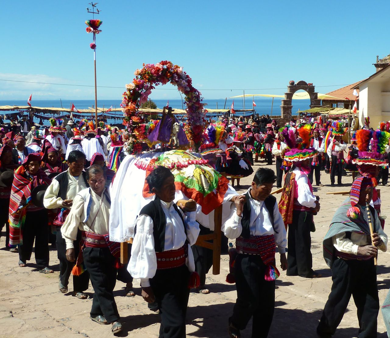 Sur cette île du lac Titicaca, la fête consacrée à Saint-Jacques se déroule chaque 25 juillet. Les festivités se prolongent jusqu’au 5 août où les habitants font des offrandes à la Pachamama (la terre nourricière, bel exemple de syncrétisme religieux) mais c’est bien le 25 que les festivités ont le plus d’ampleur. Tous les habitants décorent l’île de fleurs et beaucoup d’entre eux participent à la fête.